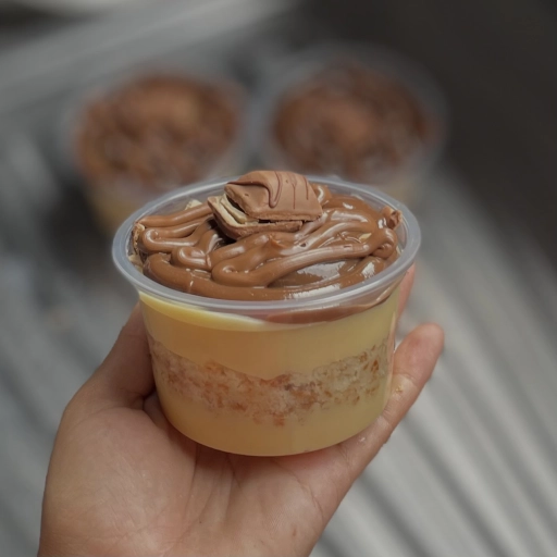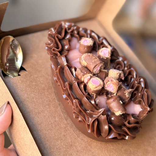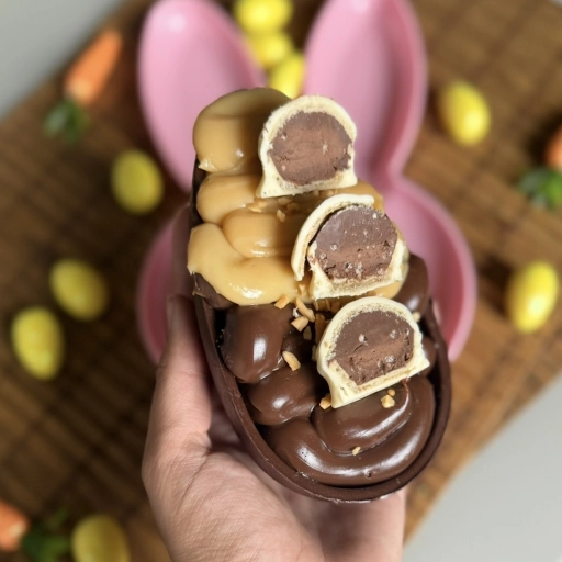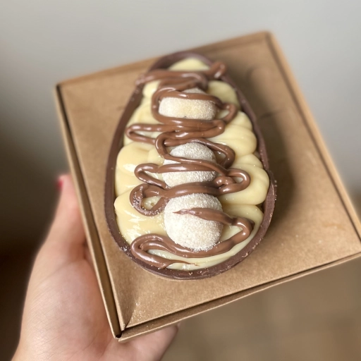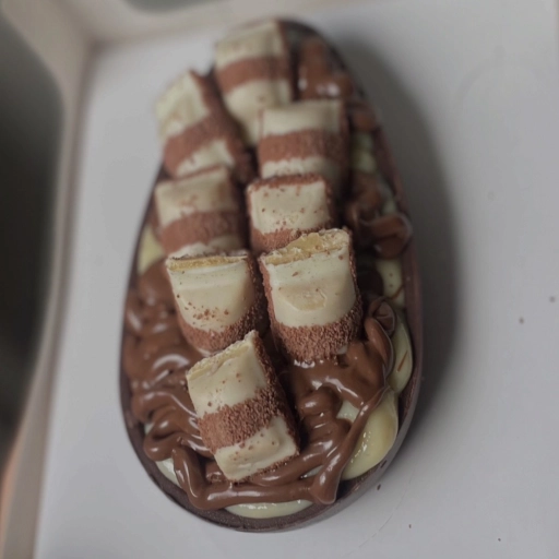 Casca de chocolate + brigadeiro de ninho cremoso + pedaços de kinder e Nutella.