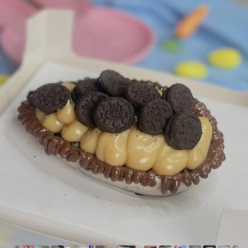 Casca de chocolate branco com pedaços de Óreo+ brigadeiro de Ninho com Óreo + Nutella .