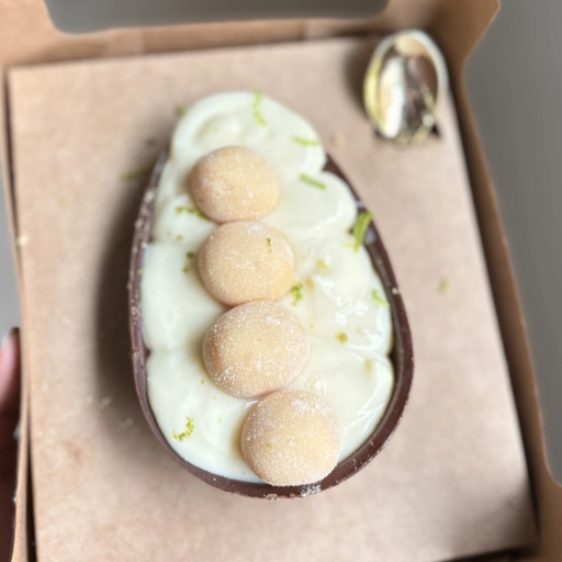 Casca de chocolate blend+ cremoso de limão + farofinha de biscoito + brigadeiros de ninho.