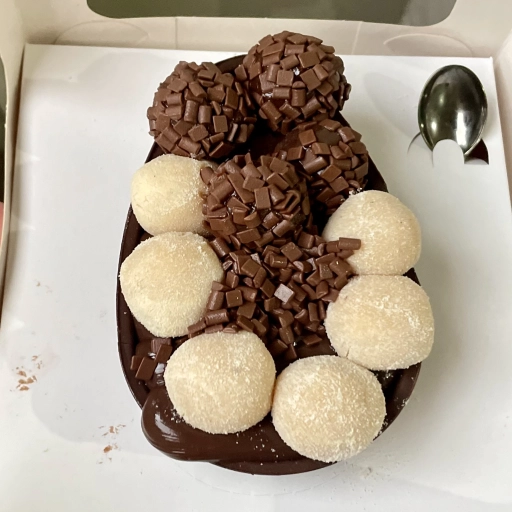 Brigadeiro de Ninho+ 1 bombom ouro branco picado+ brigadeiro de chocolate + brownie + 1 bombom ouro branco.